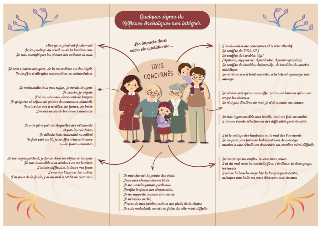 Dans l’image ci-dessous vous pourrez voir quelques « signes » qui sont révélateurs d’un ou plusieurs réflexes non intégrés.